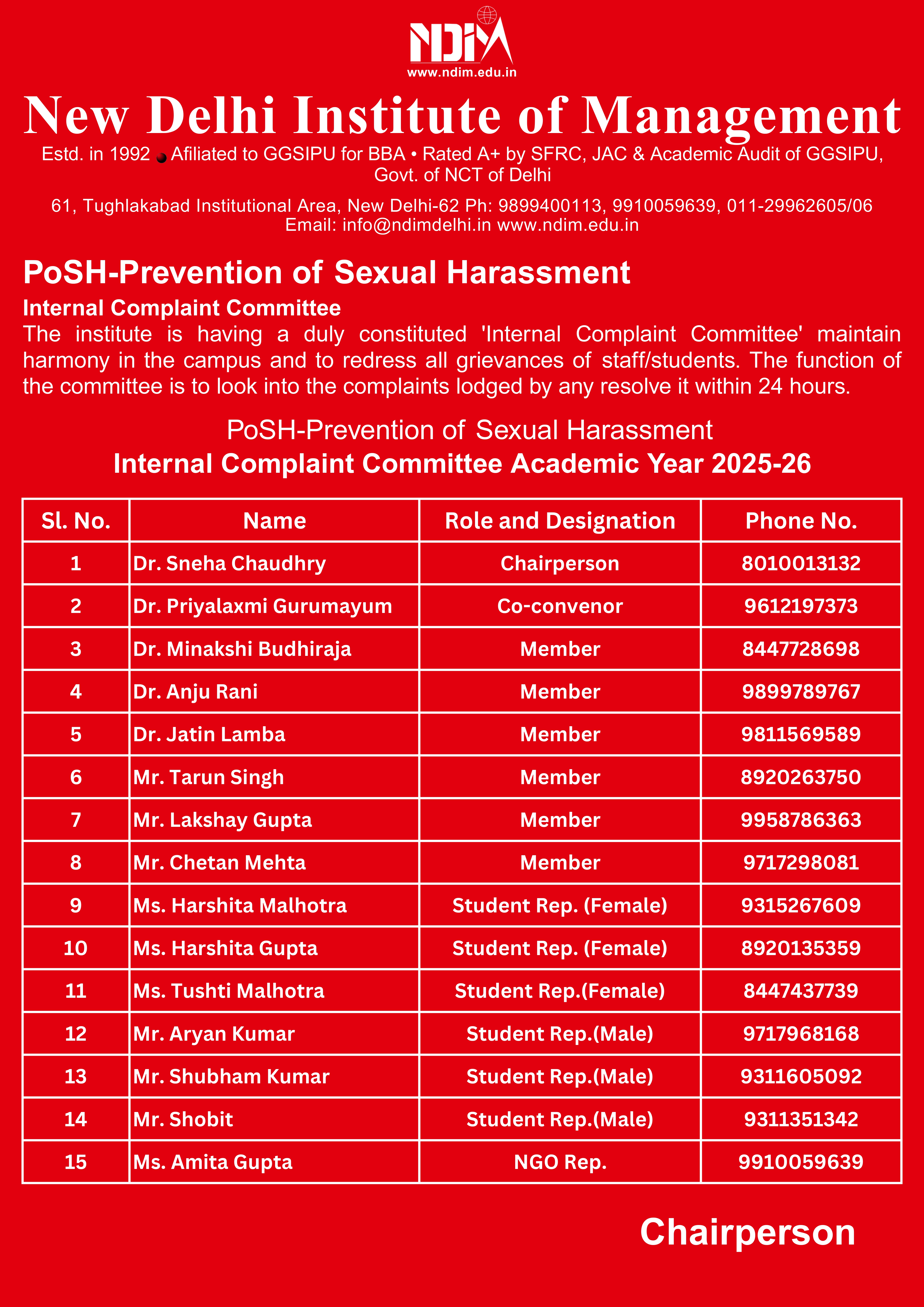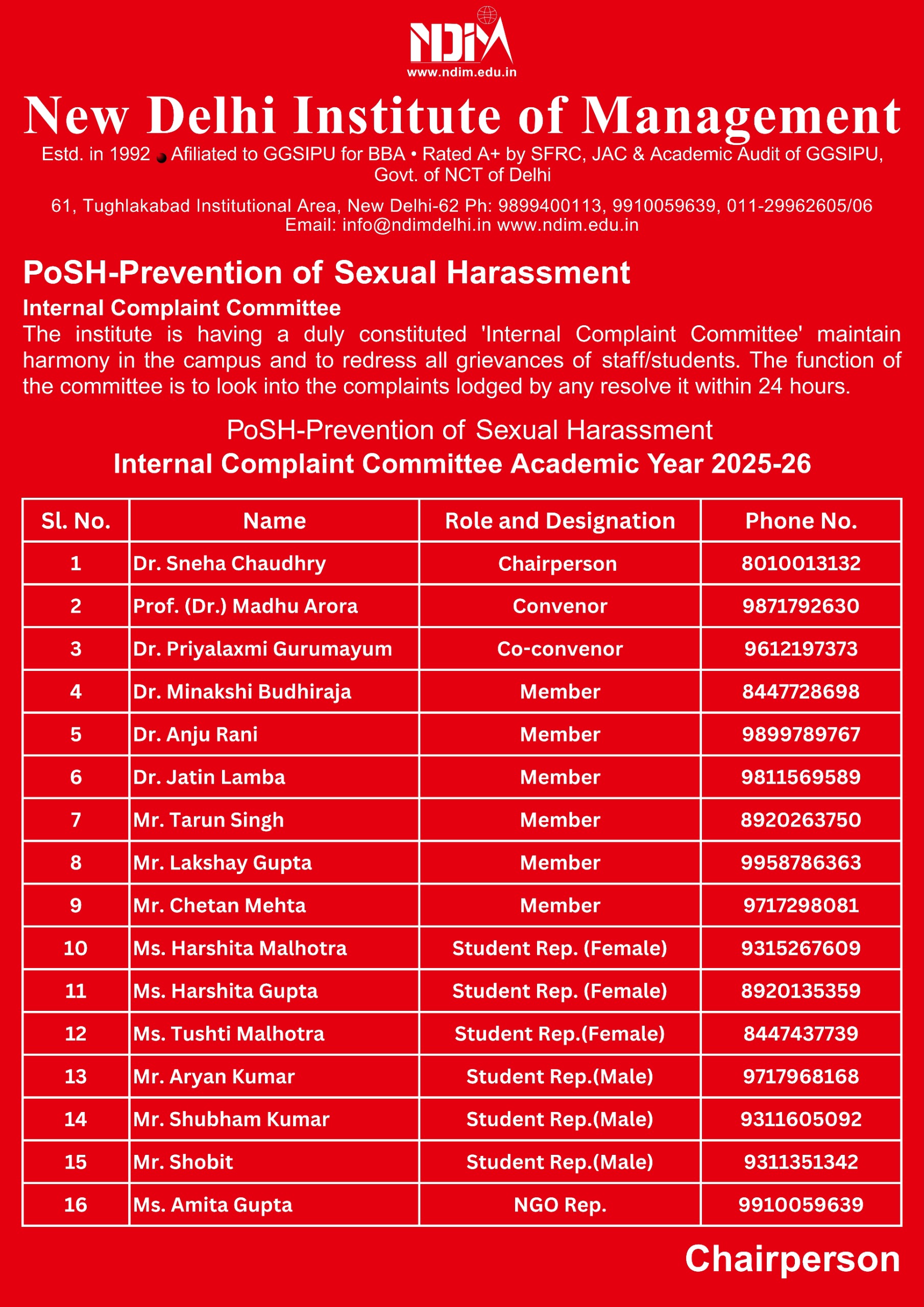 To hear and address complaints regarding sexual harassment at NDIM, and