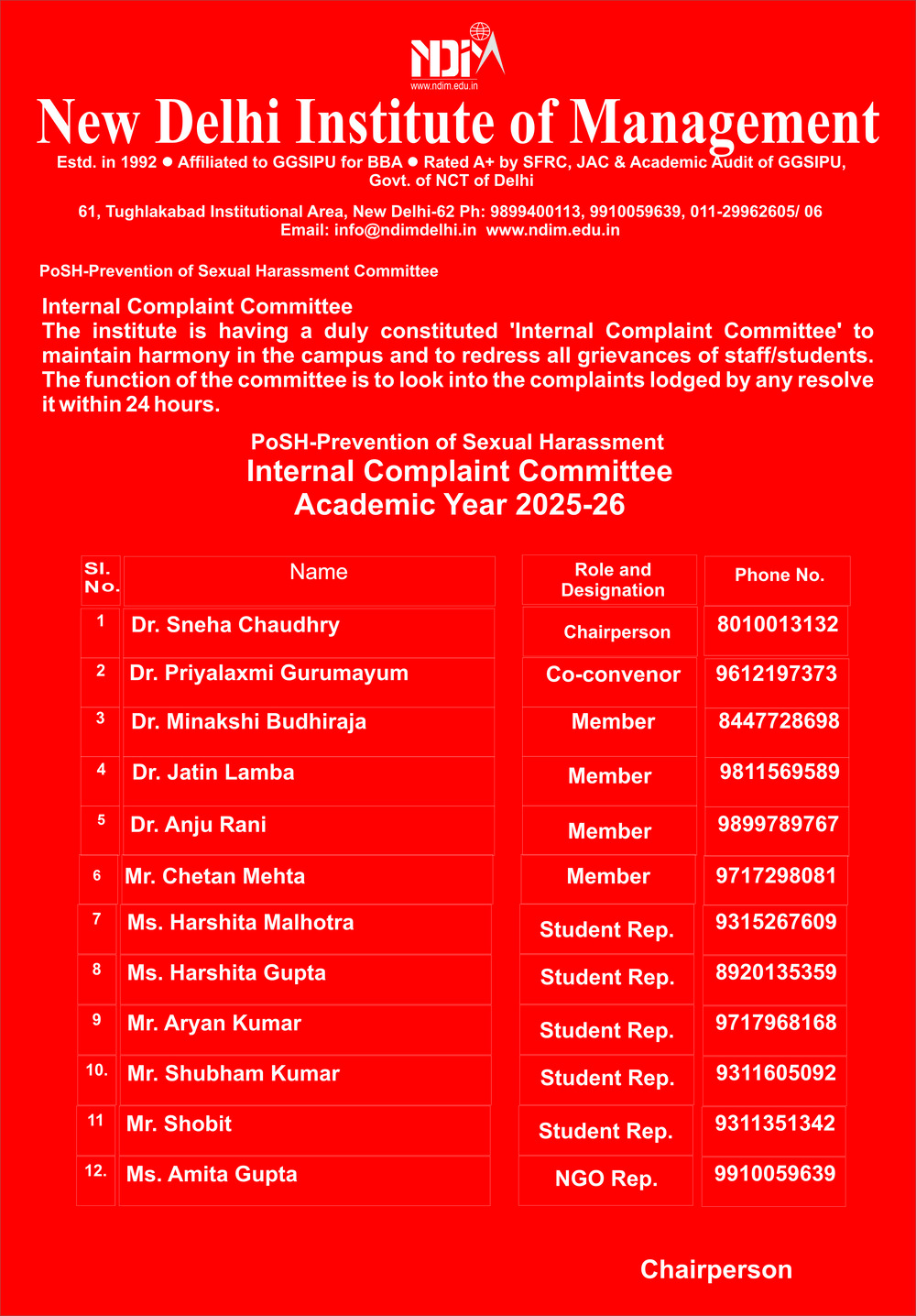 The Internal Complaints Committee (ICC) is formed according to the provisions of the The Sexual Harassment of Women at Workplace (Prevention, Prohibition and Redressal) Act, 2013. The ICC’s twin functions are: